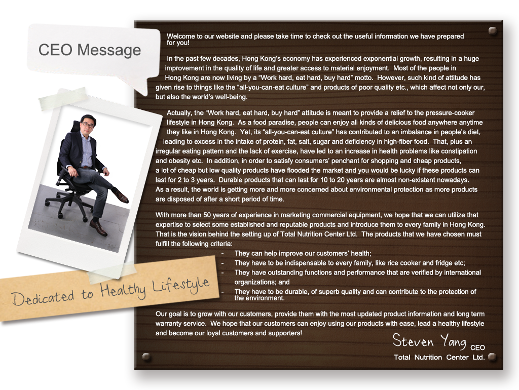 In 2001, we chanced upon Vitamix® TNC. Immediately, we realized that it is one unique product that will revolutionize people's way of living like what the washing machine and refrigerator have done. Therefore, we set up Total Nutrition Center Ltd. (TNCL) in Hong Kong in 2001 to educate people on the importance of a healthy eating lifestyle and how they can use Vitamix TNC to help them live more healthy. Vitamix TNC was a start for us and we have been sourcing other great health-enhancing products since then, namely 3M™ water filtration systems, Excalibur® ergonomic chair. We will continue looking for products that are "designed for your health" so that you can enjoy the best things in life with ease and comfort.